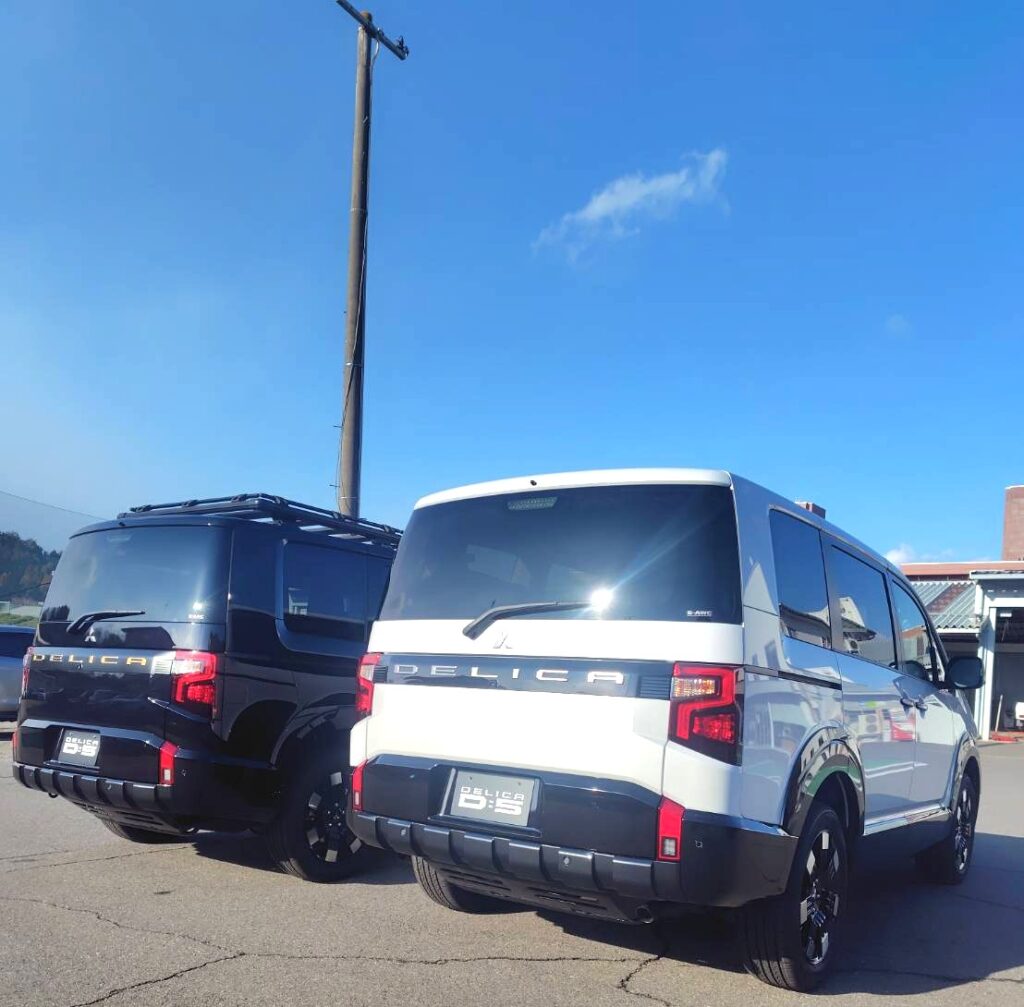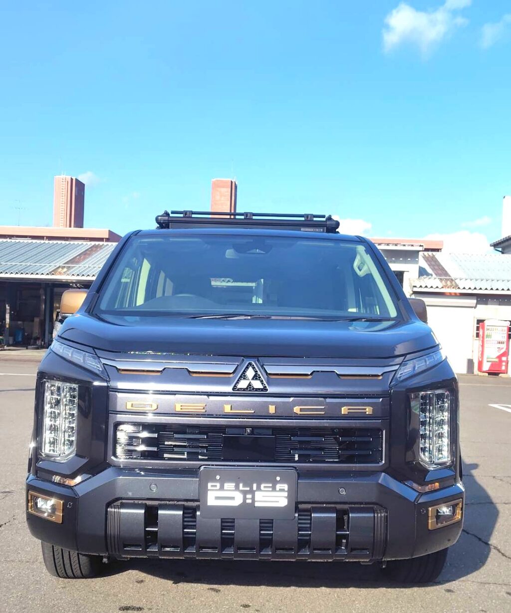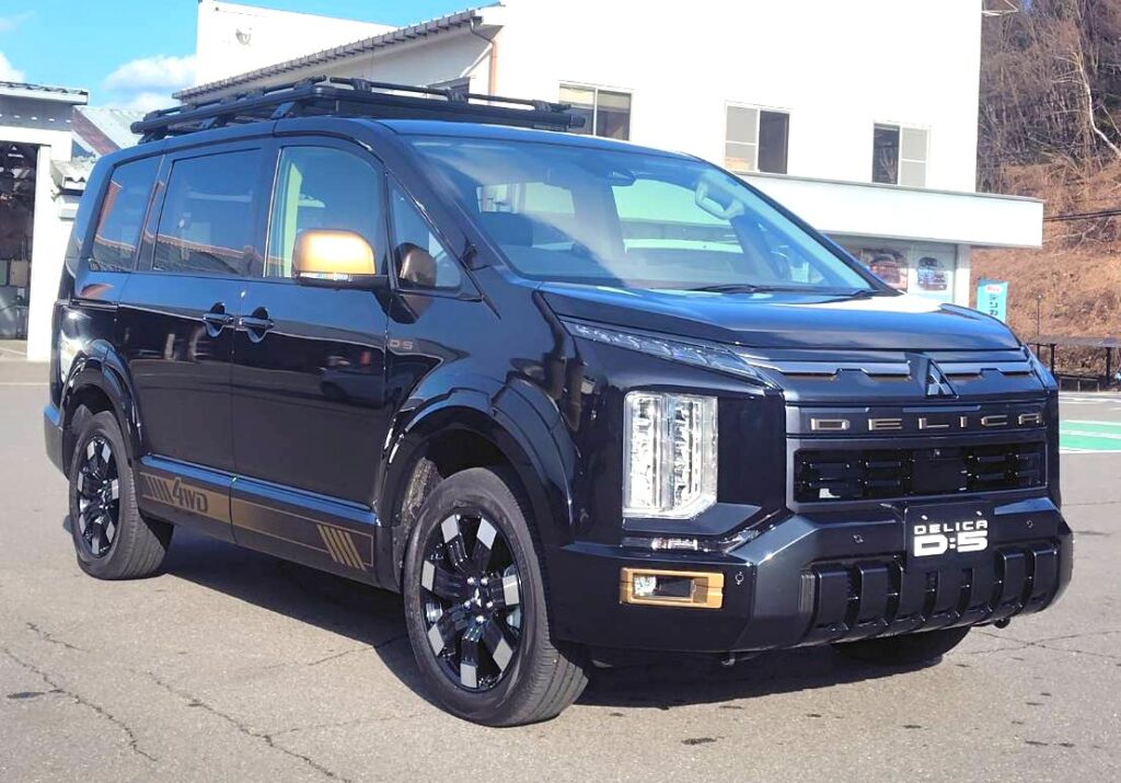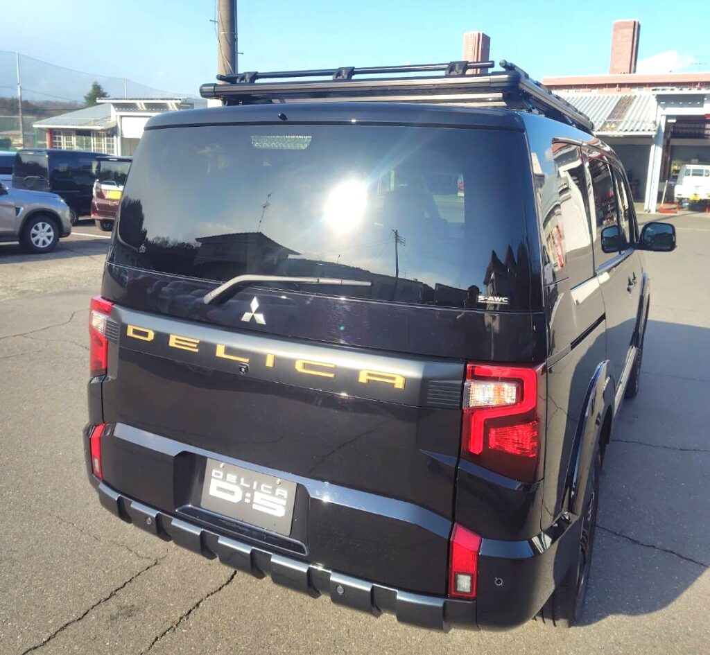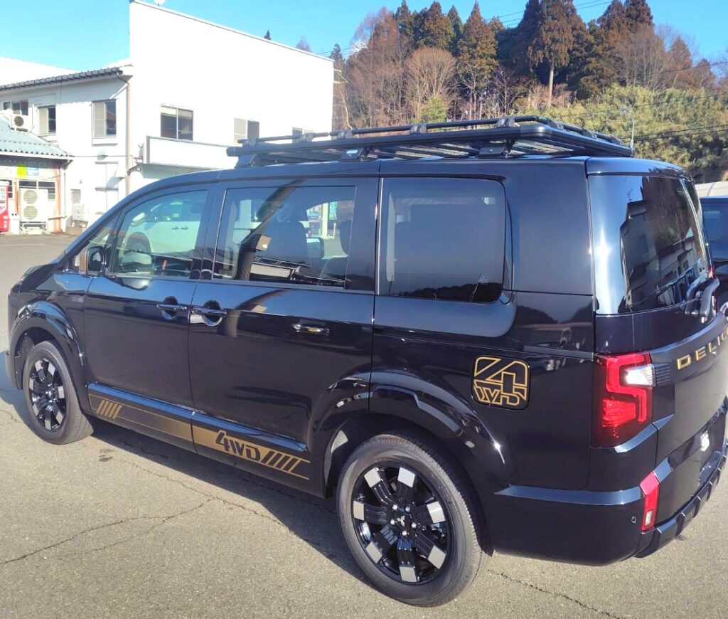 ブラックマイカのボディーにDELICAエンブレムやドアミラーカバ―など、