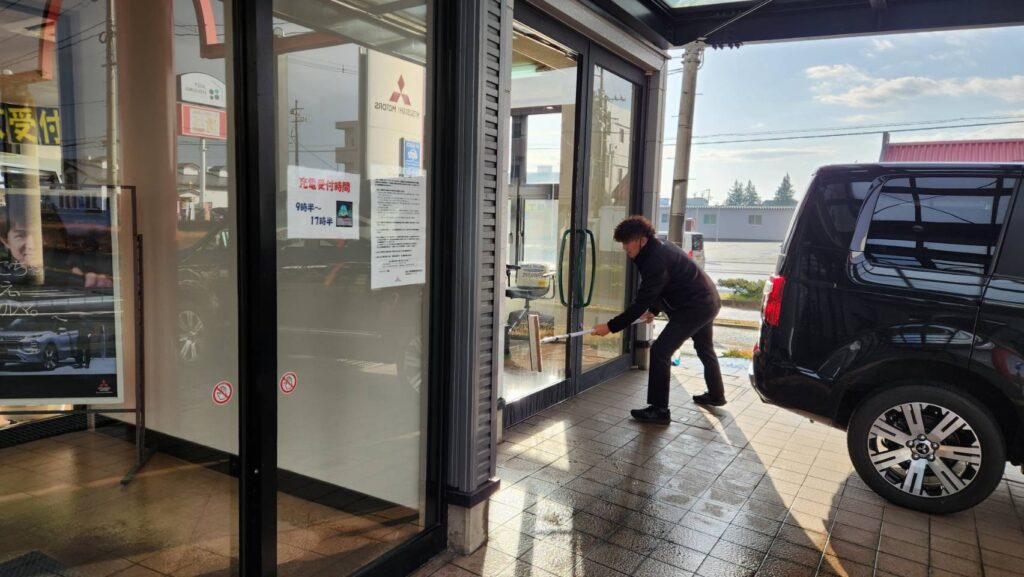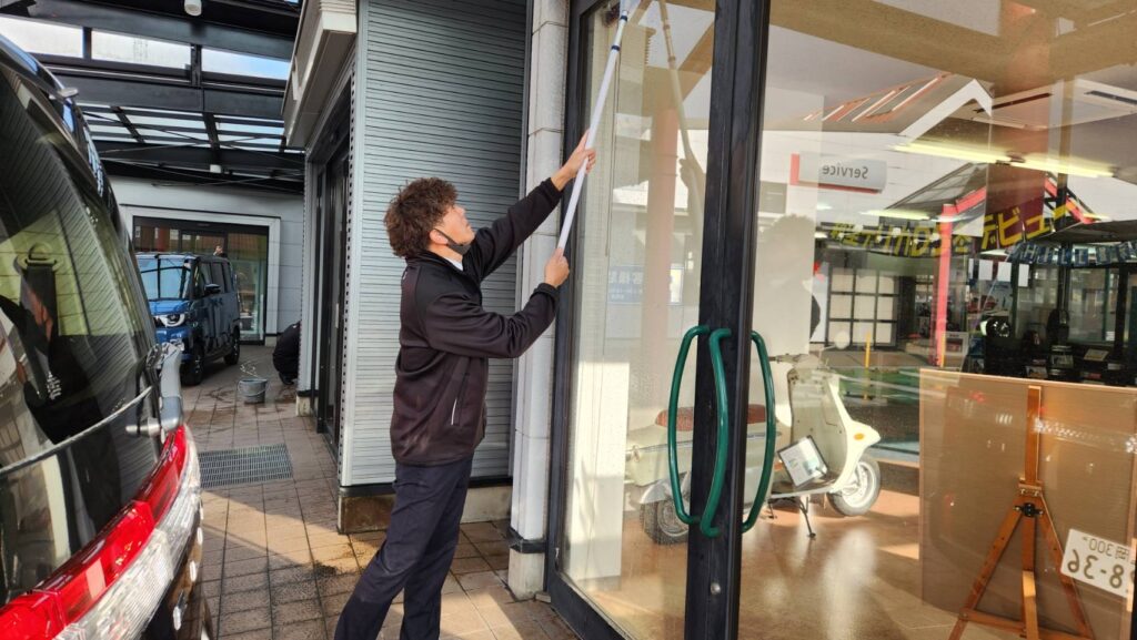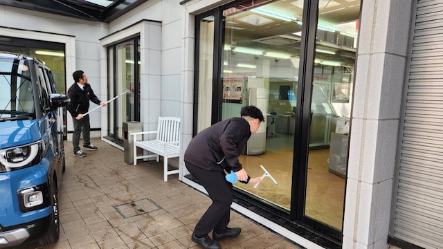 ですが今回は、スタッフ間で話し合い、店舗入り口やショールームの窓ガラスの清掃を行いました‼️