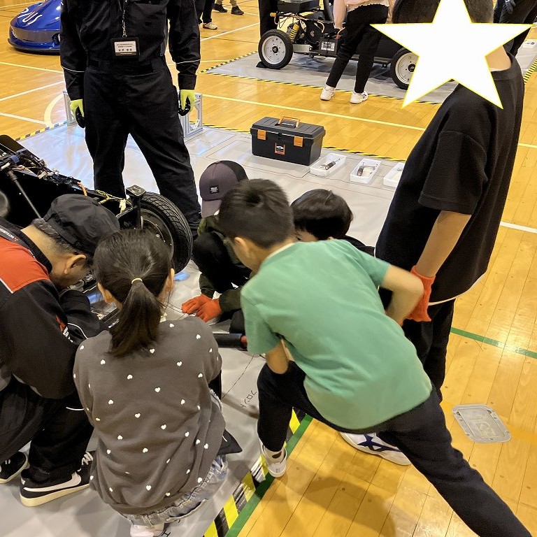 42名とたくさんの小学生が集まってくれました。カウルを外してジャッキアップし、タイヤ脱着も行いました。みんながとても楽しそうに作業していましたし、昨年に続き参加してくれた子もいました!私たちも嬉しい限りです。周りで見守っていた保護者様も、作業する子供たちの姿にビックリされていました。