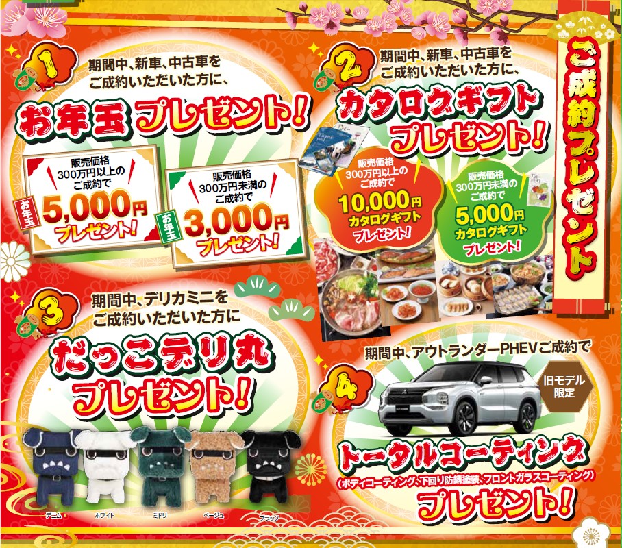 新車・中古車をご成約のお客様へ、【お年玉】と【カタログギフト】の豪華ダブルプレゼント!